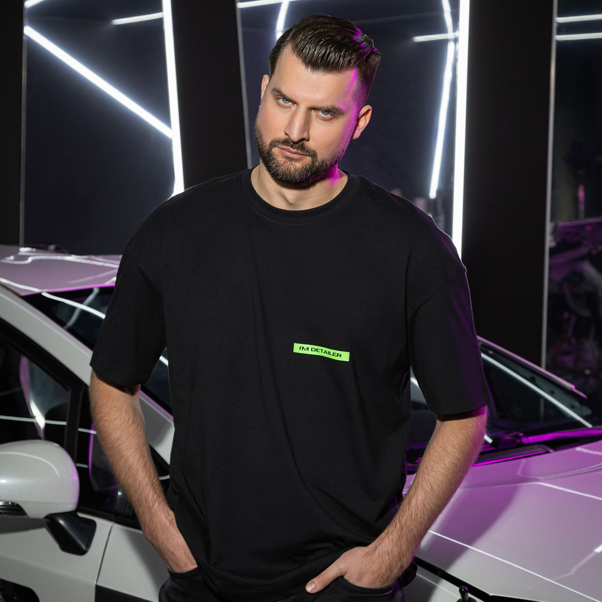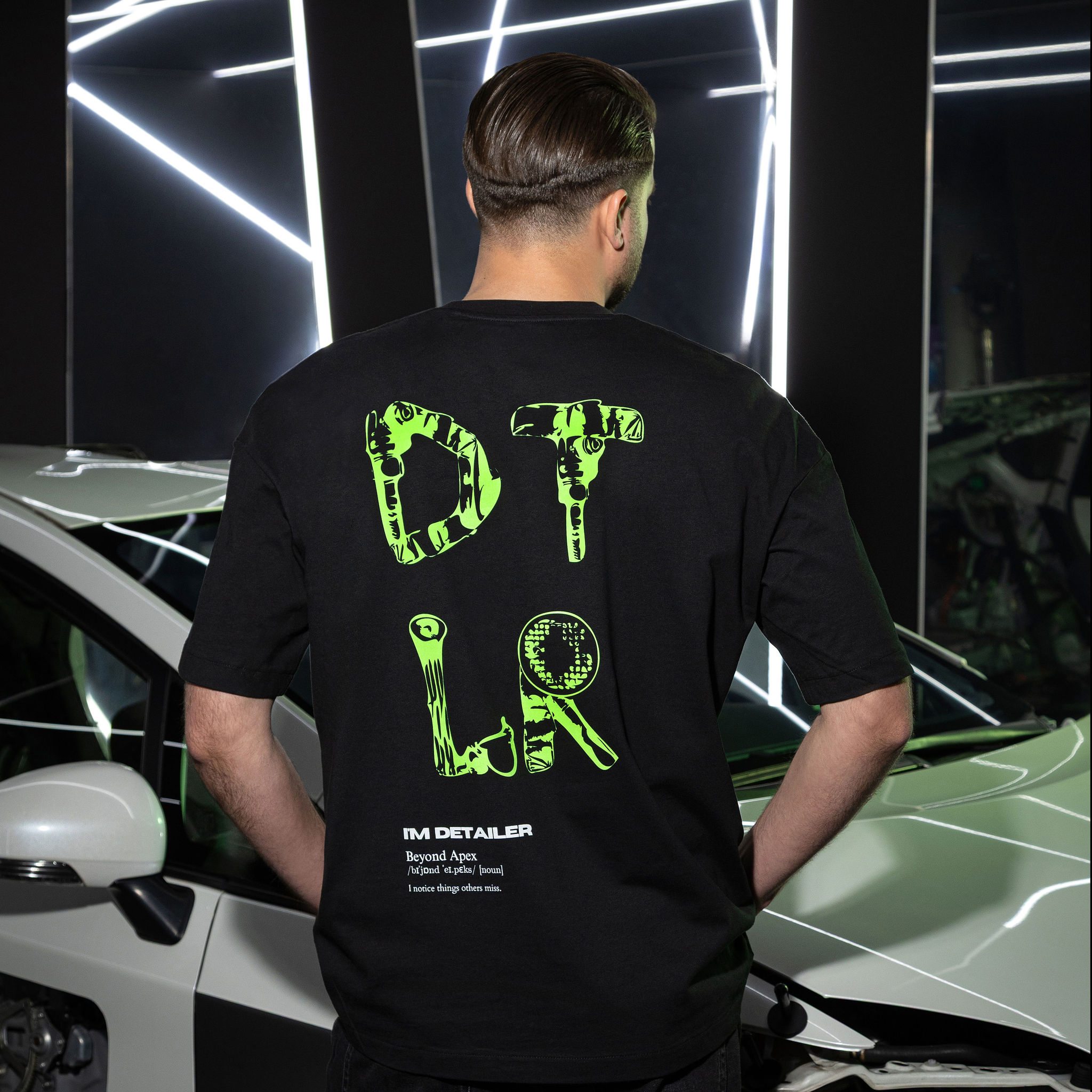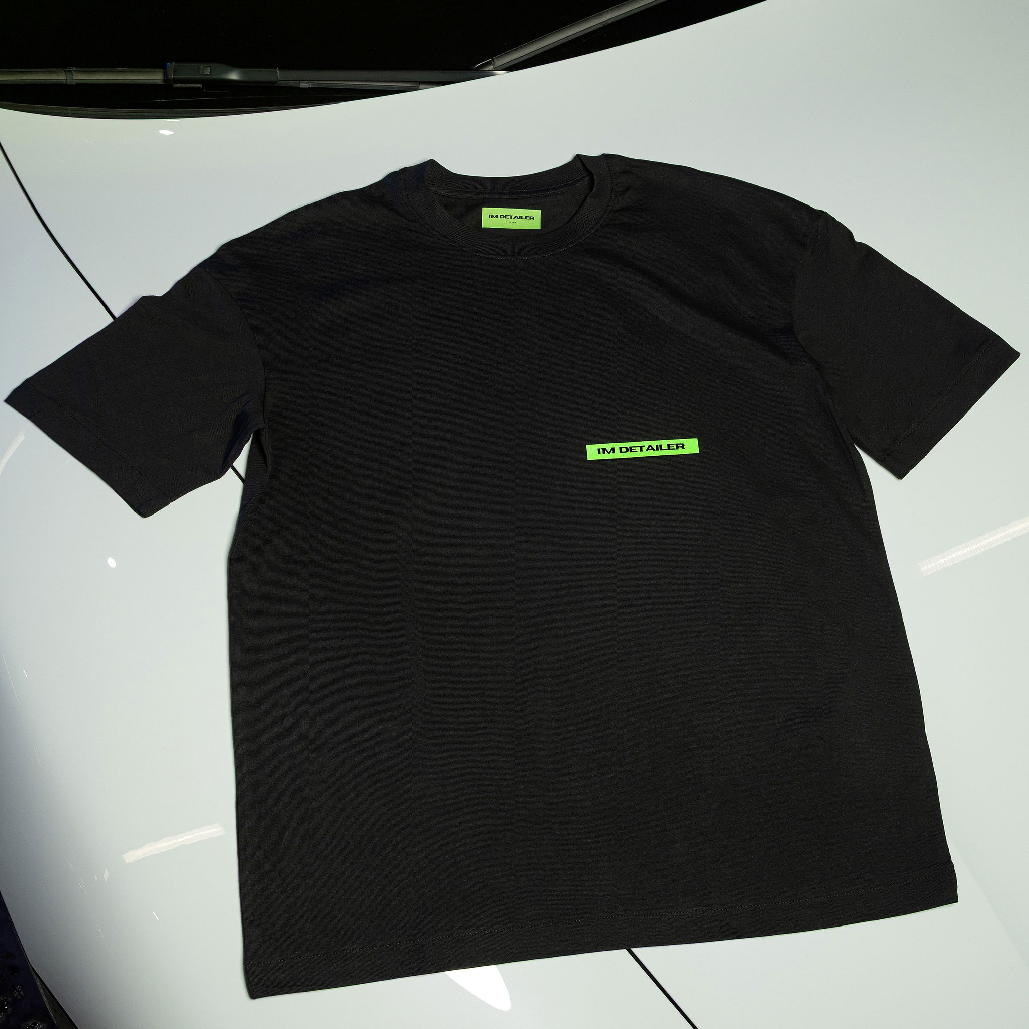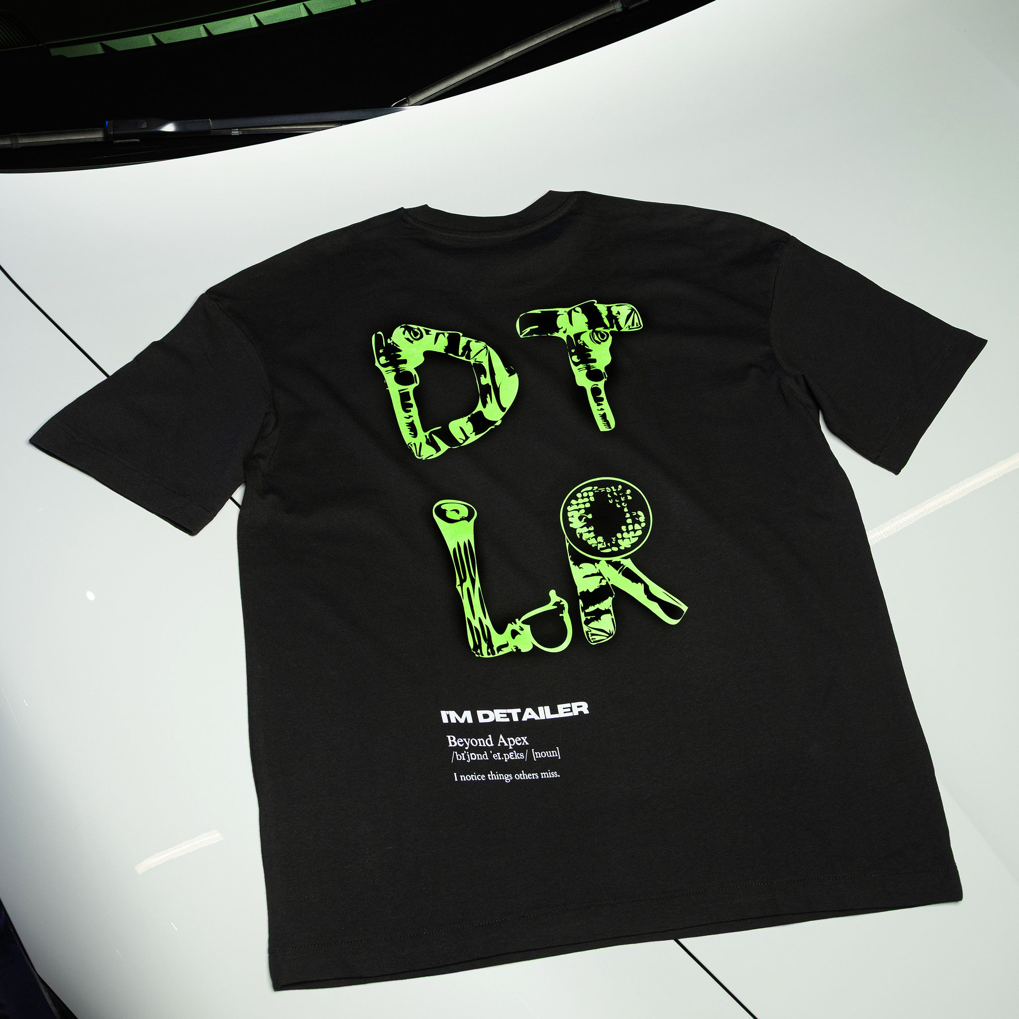Black oversized T-shirt made from high-quality, heavy cotton, featuring a subtle neon green print on the front and a striking abstract design on the back — modern, bold, and effortlessly stylish.